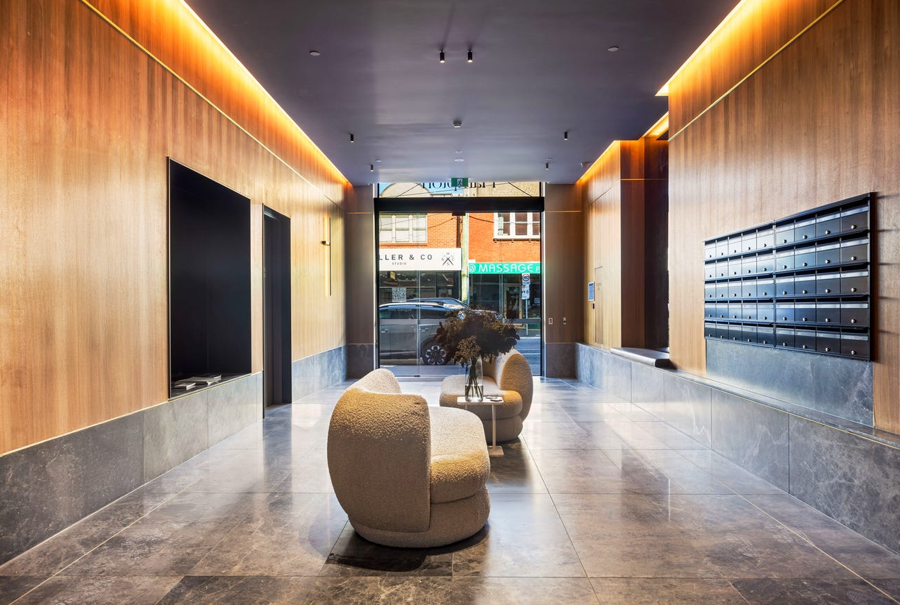 Residents of Holyrood & Hampton benefit from a suite of shared amenities designed to support relaxed, everyday living. At the heart of the offering is a rooftop terrace, where expansive bay views set the backdrop for barbecues and casual gatherings. A secure residents-only lobby offers a hotel-style arrival experience, with soft lighting, natural finishes, and a welcoming atmosphere.