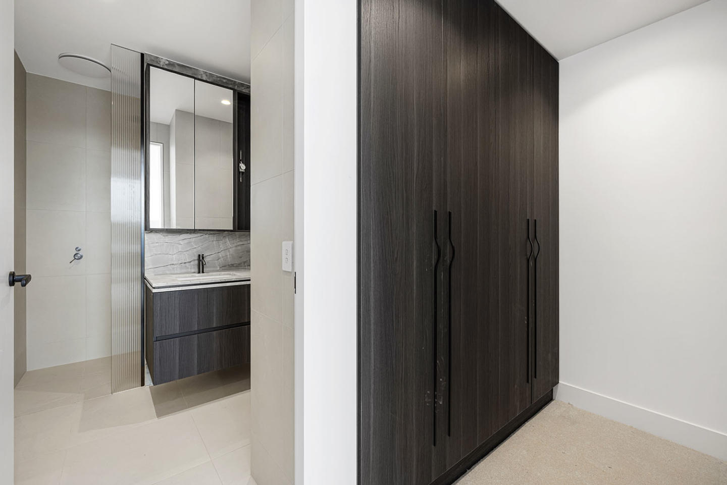 Inside each residence, timeless design is paired with intelligent planning. Floor-to-ceiling glazing draws in natural light, while open, house-like floorplans provide generous living spaces that feel calm and connected. Finishes lean towards warmth and tactility, with natural stone benchtops, sculptural detailing, and timber accents used to soften the interiors.