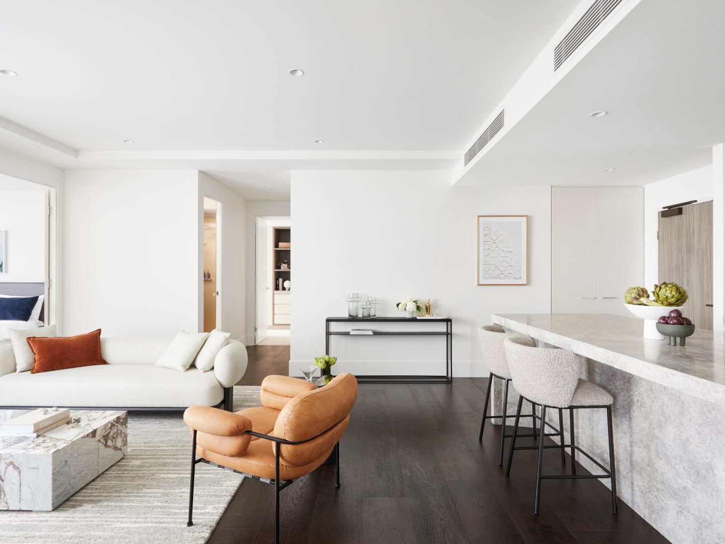Each residence at R.Iconic is designed to the highest standard, with interiors by acclaimed Australian designer David Hicks, featuring open-plan living spaces with floor-to-ceiling windows that maximise light and functionality. Kitchens are equipped with premium Gaggenau and Miele appliances, marble benchtops, and elegant bronze details, while timber flooring and bronzed glass finishes add warmth and luxury. Bathrooms are equally sophisticated with soaking tubs, frameless showers, and earthy-toned feature walls. Master bedrooms offer spacious wardrobes, private balconies, and unobstructed views, creating a perfect retreat.
