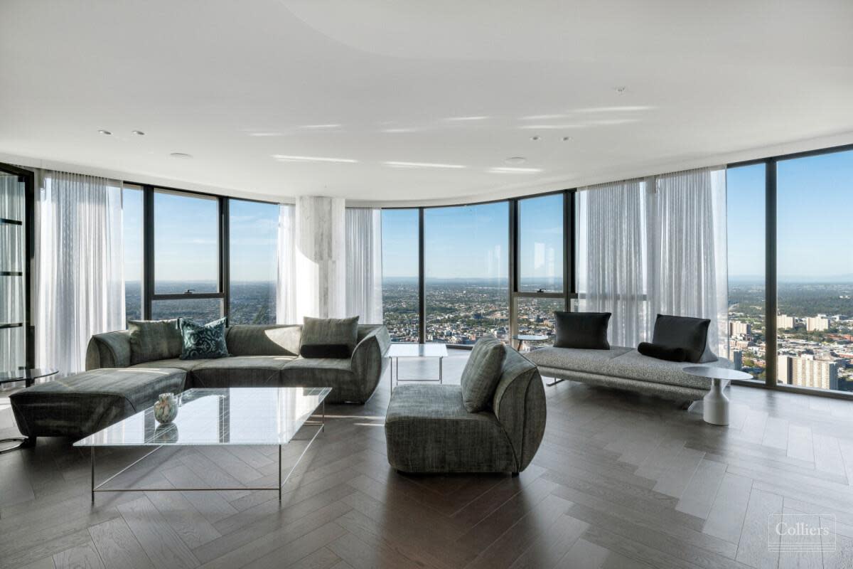 This majestic north facing, sub-penthouse on level 55, boasts 180-degree panoramic views of the UNESCO World Heritage listed Carlton Gardens, the Royal Exhibition Building, and the Melbourne CBD