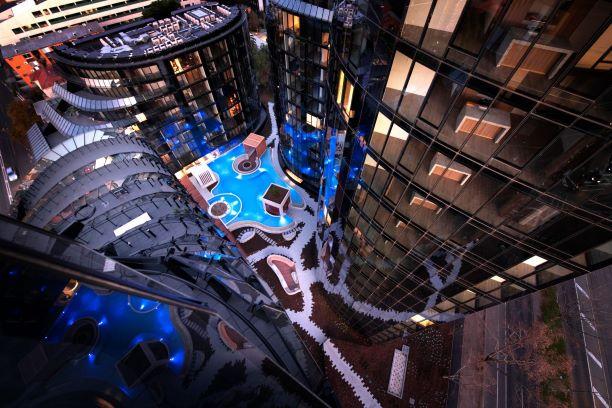 Those are the names for the three soaring and cascading glassy towers that encompass St. Boulevard.