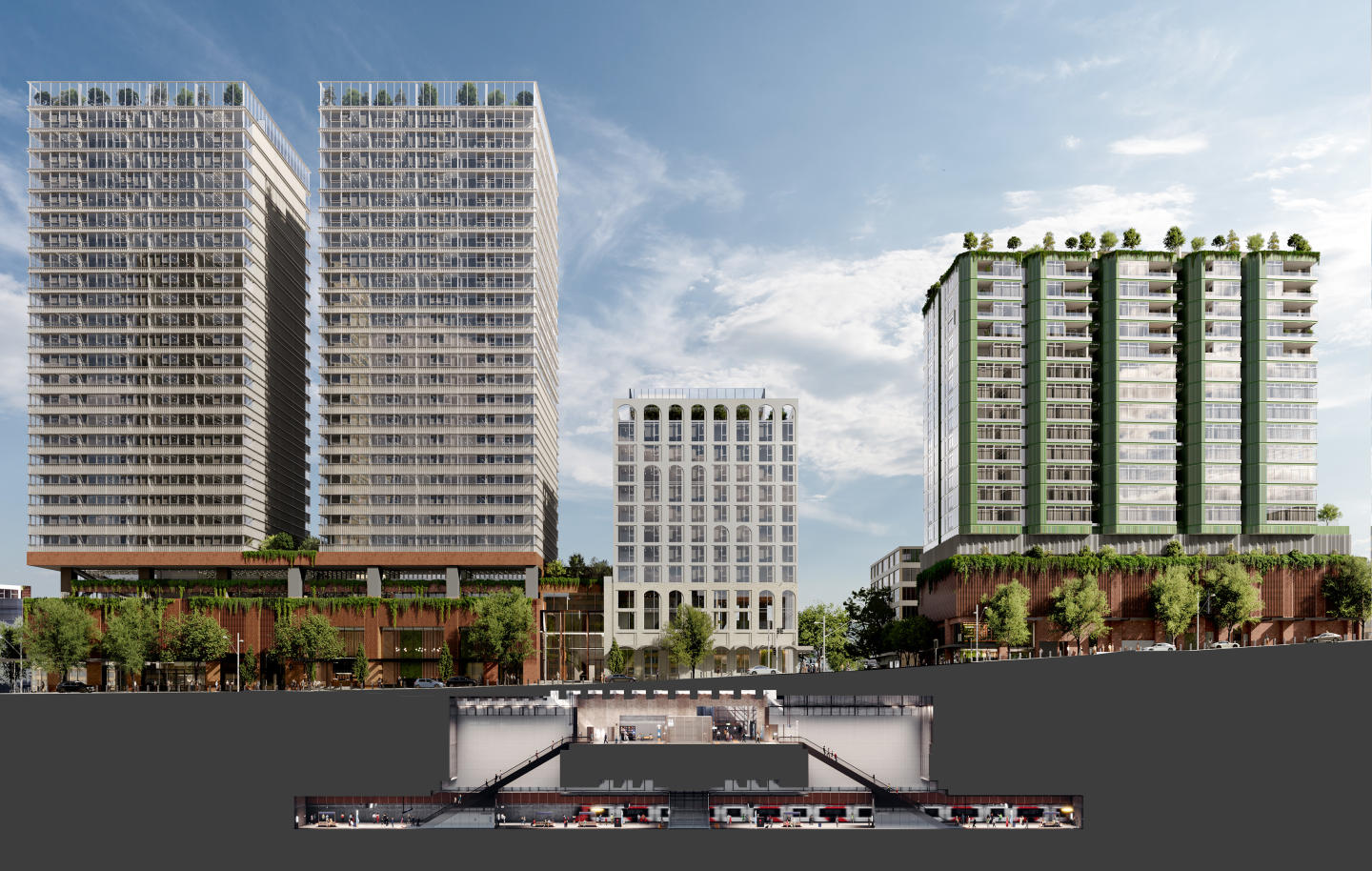 The existing buildings and trees will be demolished to make way for 4 new residential buildings. There will be 314 apartments in total, ranging from studios to 5-bedroom apartments. Each building will have its own private terraces. The exterior of the buildings will feature concrete, sandstone, light and medium brick, as well as a range of metal cladding in neutral and earthy tones. A new road will also be constructed on the site. Basement car parking for 542 vehicles is included in the plans. Stamp duty rebate now available for a limited time.