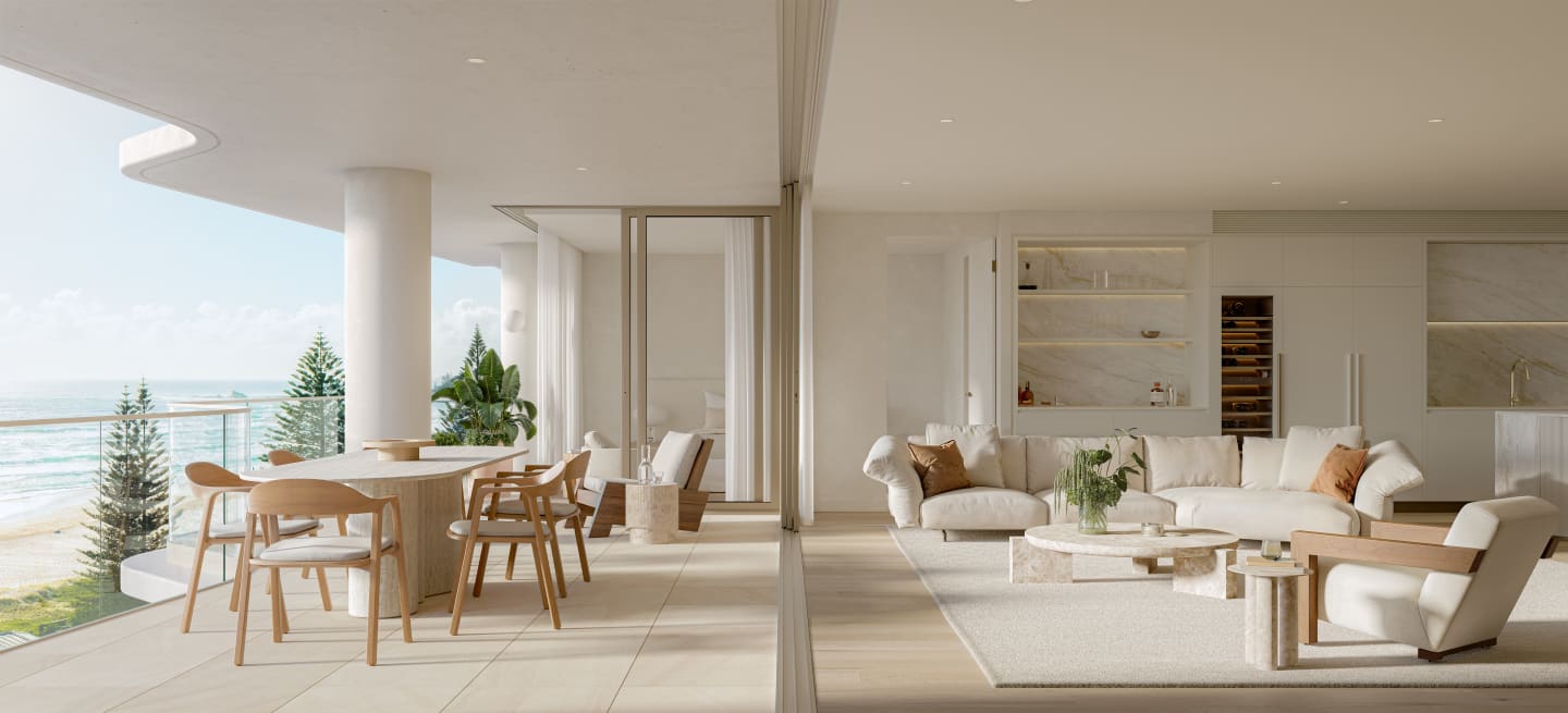 Bilinga House is a new apartment development located at 107–109 Golden Four Drive, Bilinga, Queensland. Comprising just 47 residences, this boutique project offers a choice of two- and three-bedroom apartments, with prices starting from $1.2255 million for two-bedroom residences and $2.005 million for three-bedroom residences. Positioned only 200 metres from the beach, it combines rare coastal proximity with considered design, providing a home that is both connected to the surrounding landscape and grounded in architectural quality. Interiors designed with natural materials and calming tones. Inside Bilinga House, Rothelowman’s architectural approach draws on the project’s location, allowing sunlight and sea breezes to fill each residence. The interiors feature natural materials and soft, neutral tones, creating a calm and inviting atmosphere. Every detail has been thoughtfully curated to enhance wellbeing, making each apartment feel both functional and restorative. Private onsite amenity for residents. Residents enjoy exclusive access to a range of onsite facilities designed to support both relaxation and an active lifestyle. These include a resort-style swimming pool, a gym, and a sauna. Professional onsite management ensures these spaces are maintained to a high standard, providing a secure and enjoyable environment. Coastal location with nearby lifestyle amenities. Bilinga House is set within the Southern Gold Coast, an area known for its quiet, unspoilt character and easy access to celebrated destinations. The Oceanway pathway is moments away, leading south to the surf breaks and boutique shopping of Coolangatta and Kirra, or north to Palm Beach and Burleigh’s dining and bar scenes. Gold Coast Airport is just three minutes from the development, offering domestic flights to Sydney, Melbourne, and Adelaide, as well as direct international links to New Zealand. Experienced project team behind Bilinga House. The development is led by Centa Property Group, whose portfolio spans retail, commercial, and residential projects across South-East Queensland. Architecture is by Rothelowman, with construction delivered by Greyburn Builders — a company established in 1987 with a track record of quality craftsmanship. Arrange a private appointment at the display suite. A display suite is located at 39 McLean Street, Coolangatta, and is open for private appointments. Here, visitors can learn more about the development, explore the design direction, and view the available apartment options. To arrange a time, submit an enquiry.