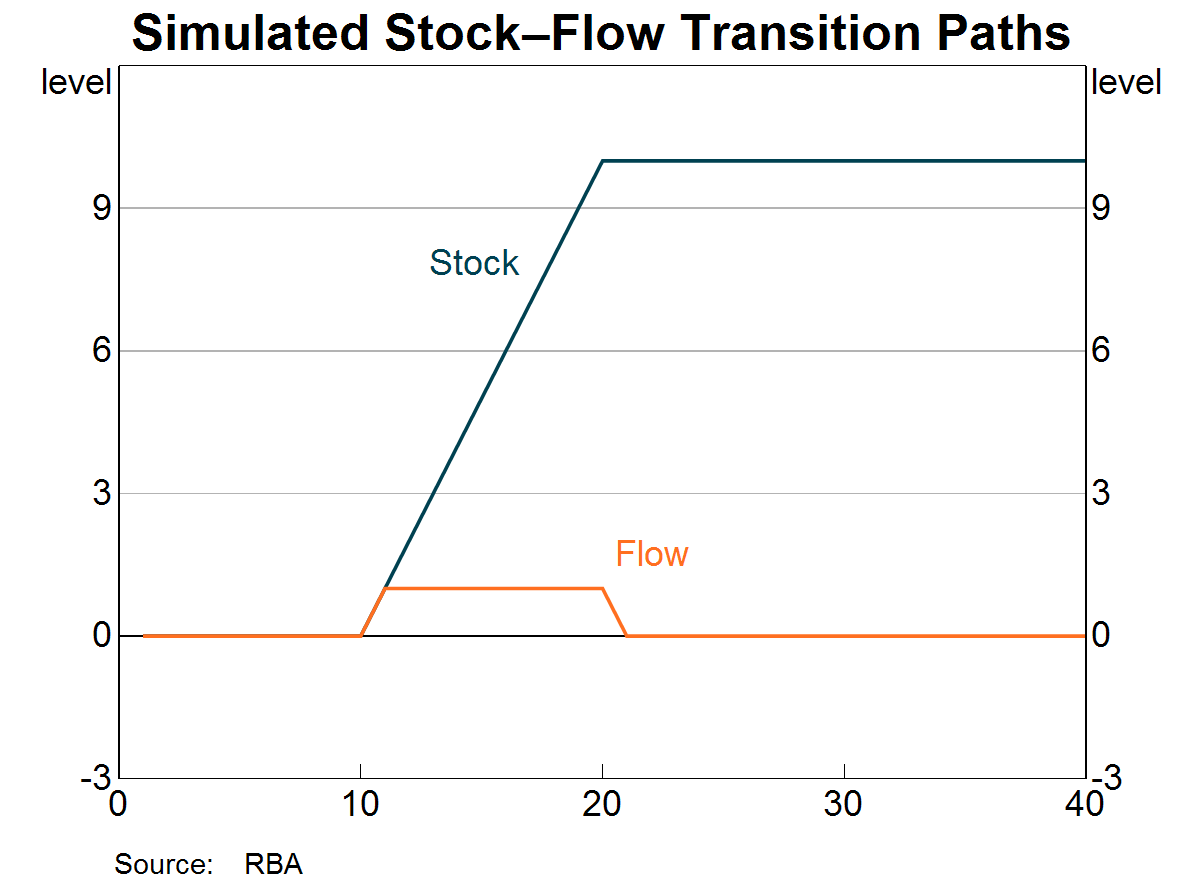 The flow is the thing we can influence, but often it is just a small fraction of the stock. Because of this, the flow variable will typically ‘boom’ when some shift in the fundamentals means the stock variable needs to be higher. And when the stock transition is over because it has reached that equilibrium, the flow will ‘bust’. In the simplest stylised example one can construct, the stock and flow will look something like this (Graph 1).