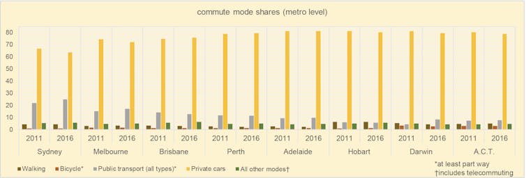 Public transport use remains relatively low. Even in Sydney, it captures only about one-quarter of commute trips.