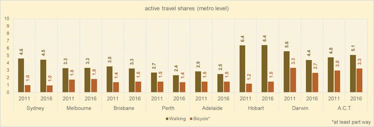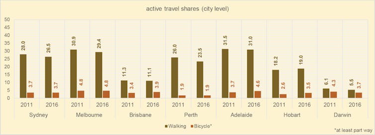 In theory, Australian cities are ideal for walking and cycling. They have mild climates, stable and wealthy governments, as well as sporty, outdoorsy and increasingly health-conscious residents. Despite this, the data show that overall active travel (especially cycling) is still marginal.