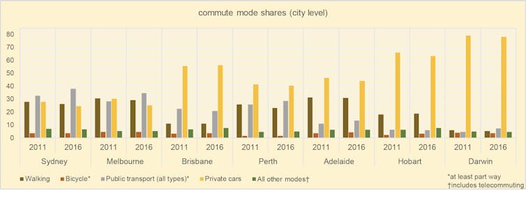 Meanwhile, rates of walking and cycling remain constant and low – even in smaller centres such as Hobart, Darwin and Canberra. Even in the most “cycling-oriented” places (Darwin and Canberra), only about 3% of commuters cycle.