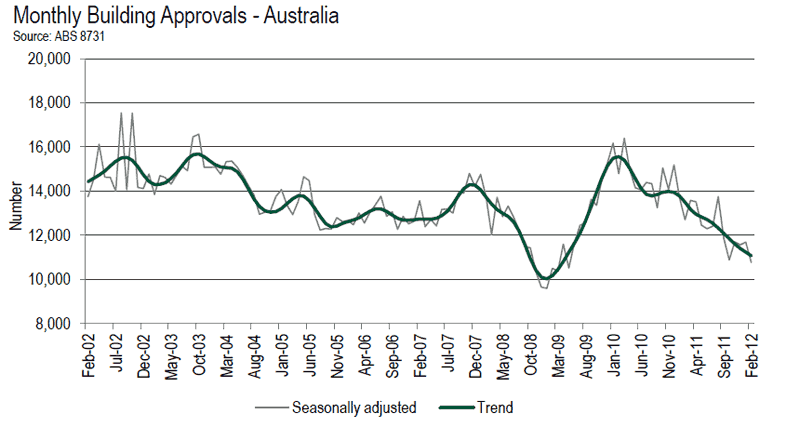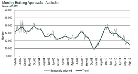 "It is difficult to be positive about the short term prospects for new housing when a 7.8% decline in building approvals in February 2012 takes them to their lowest level since March 2009.