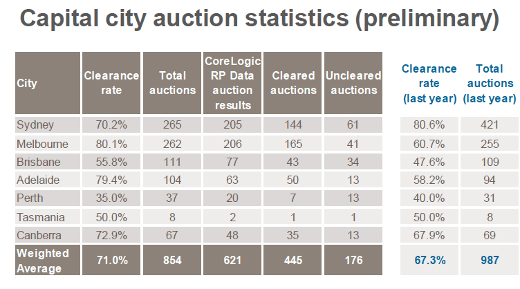 Auction numbers were actually higher than a year ago across Melbourne, Brisbane, Adelaide and Perth. Despite the lower number of auctions compared with last year, the preliminary auction clearance rate, based on the 621 auction results reported so far, was recorded at 71 per cent across the combined capital cities.