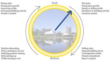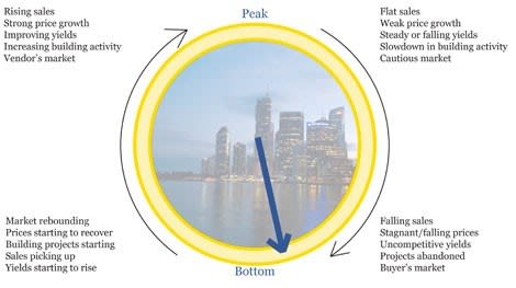 At 12 o’clock the market is at its peak (demand exceeds supply), at 3 o’clock the downswing has set in (an evenly supplied market0,) and by 6 o’clock it has bottomed out (an oversupplied market). At 9 o’clock the market is rebounding (supply is tightening).