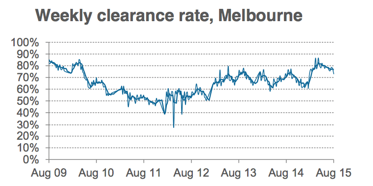 The inner region of Melbourne holds a preliminary auction clearance rate of 69.5% from a total of 206 auctions for the week ending 23 August 2015, according to CoreLogic RP Data's Property Market Indicator Summary.