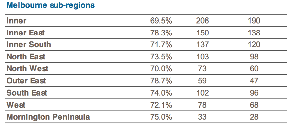 Melbourne's inner east had 150 total auctions with a clearance rate of 78.3% and the outer east a total of 59 auctions with a clearance rate of 78.7%