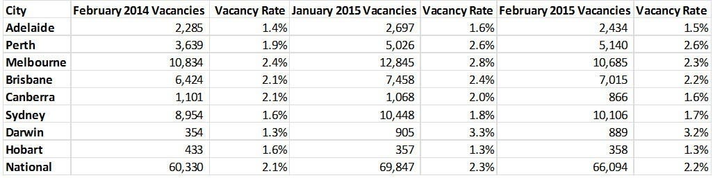 In Perth and Darwin, SQM Research managing director Louis Christopher predicts that vacancies are likely to continue to climb throughout the year. While Darwin's vacancy rate was down slightly for the month, from 3.3% to 3.2%, in February of last year it was at just 1.3%. Likewise, in Perth the vacancy rate has remained stable at 2.6% over the past two months, but is up from February 2014's 1.9% result.