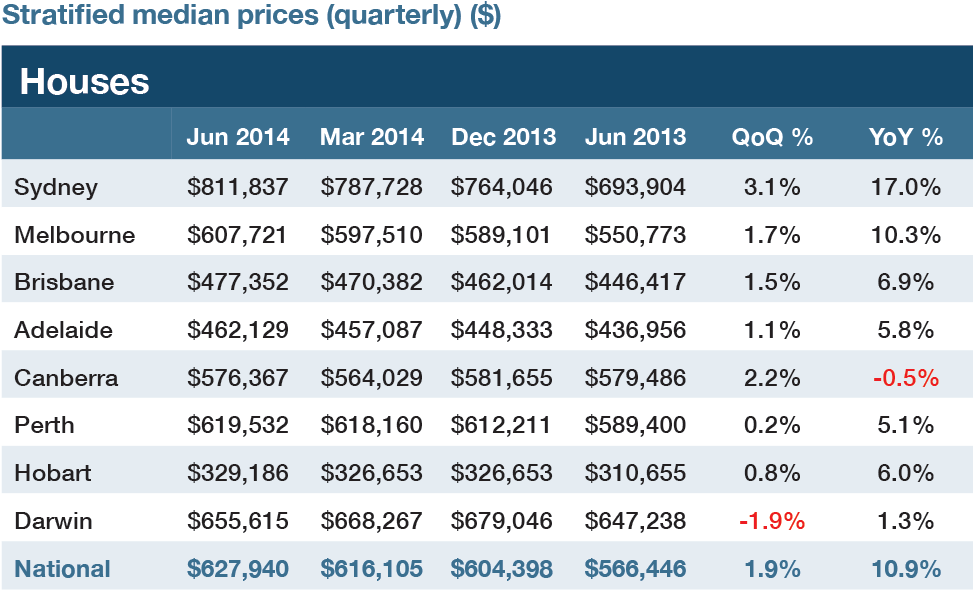 Sydney's overall 3.1% June quarter increase took the 2013-14 financial year house price growth to 17%, well beyond the nearest capital rival Melbourne with a 10% rise in house prices to $607,700.