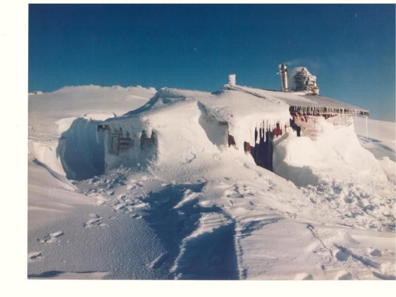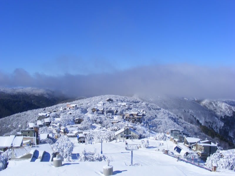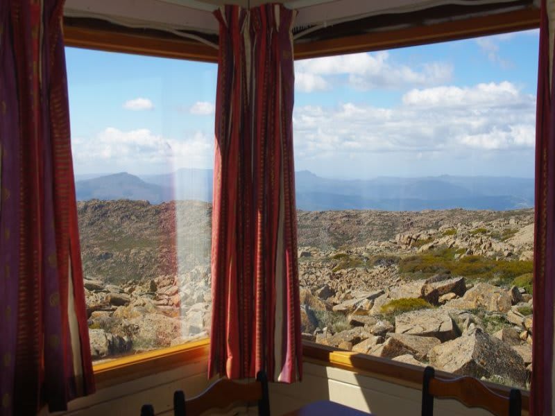 It has views of the Bogong Valley and snow-capped mountains.