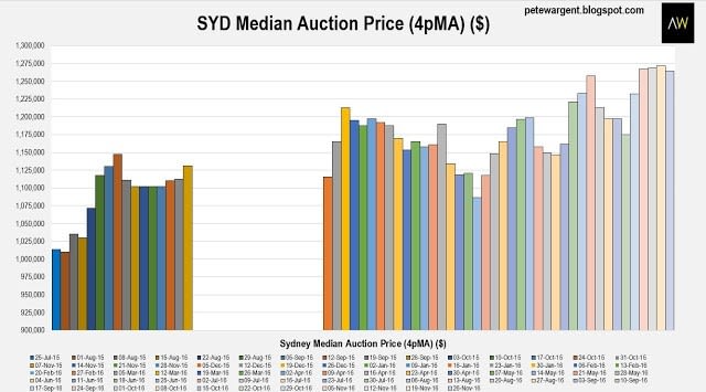 Smoothing the median auction prices of a 4pMA basis shows that over the past two months median auction prices have been tracking about 10 per cent or so higher than a year ago.