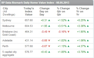 RP Data’s index shows that prices have increased in the past 12 months across all major capital cities, most notably in Sydney (+5.25%), Perth (+4.37%) and Melbourne (+3.36%).