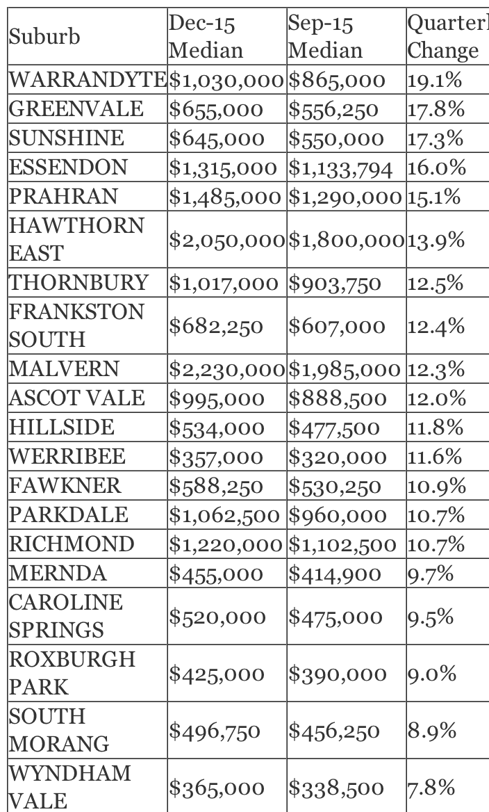 Melbourne's Warrandyte topped the list of suburbs in December 2015 quarterly growth, according to latest REIV stats.