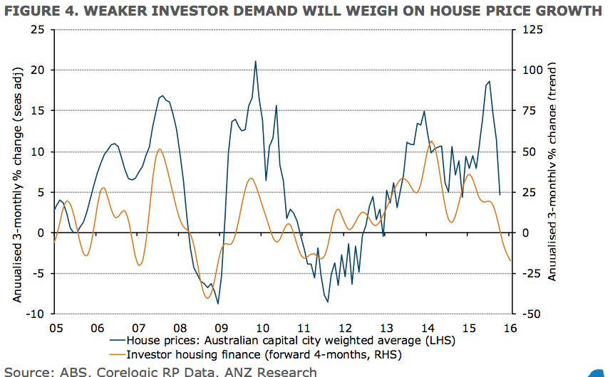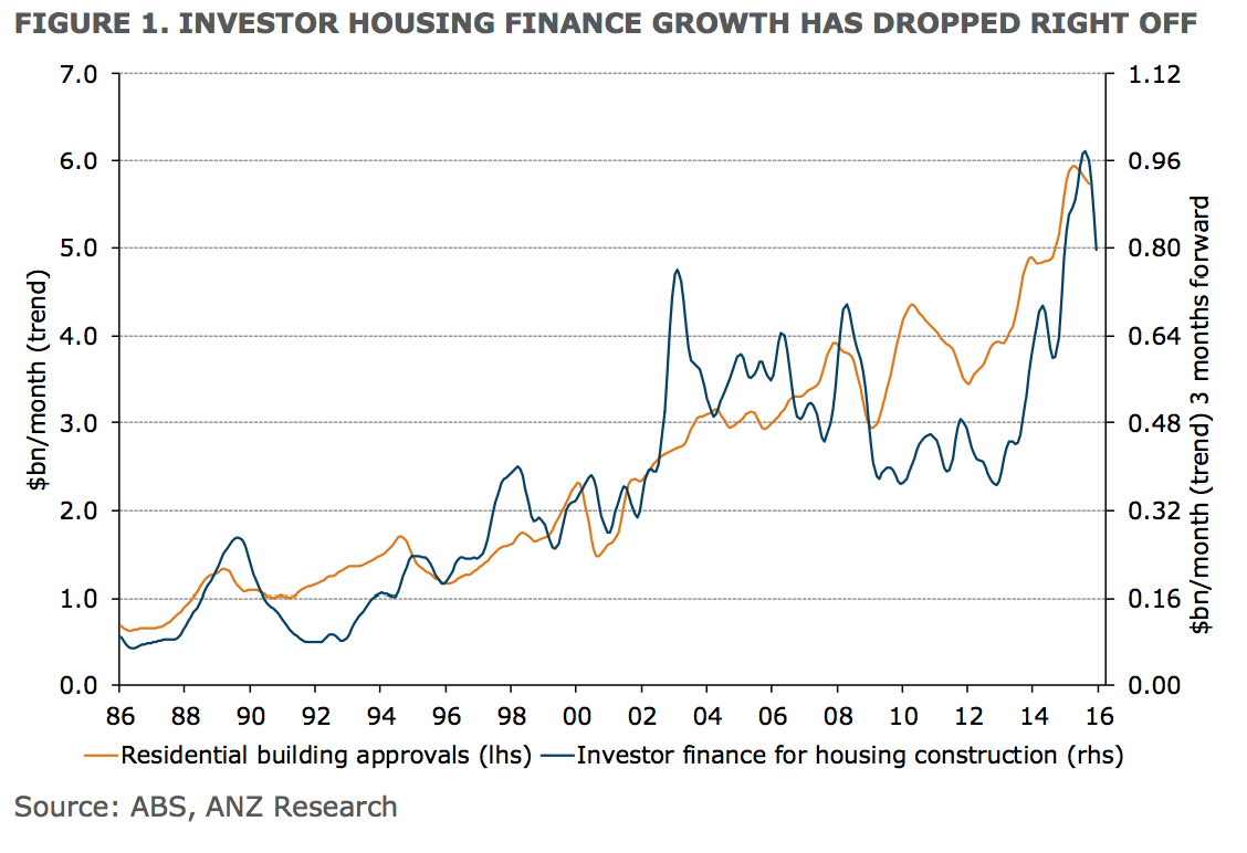 While today’s report also showed an increase in upgrader lending, the impact of the changes to investor lending standards in recent months is clearly net negative for housing market sales activity and housing construction. Slower auction market sales, weaker house price growth and higher mortgage rates in recent weeks point to a soft housing market outlook in 2016.