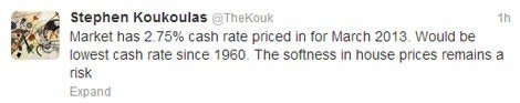 The benchmark RBA cash rate will be at its lowest point since 1960 should the cash rate fall to 2.75% by March 2013, as is being priced by futures markets, Business Spectator columnist and economist Stephen Koukoulas has tweeted today.