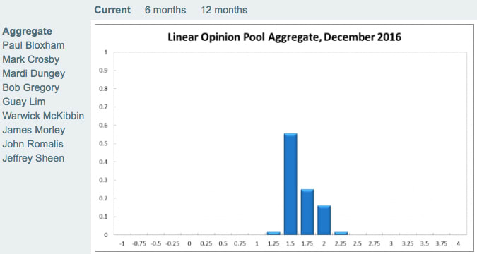 A year out, the Shadow Board members’ confidence that the cash rate should be held steady equals 17 percent (18 percent in November), while the confidence in a required cash rate decrease fell four percentage points to 6% and the confidence in a required cash rate increase equals 77 percent (72 percent in November).