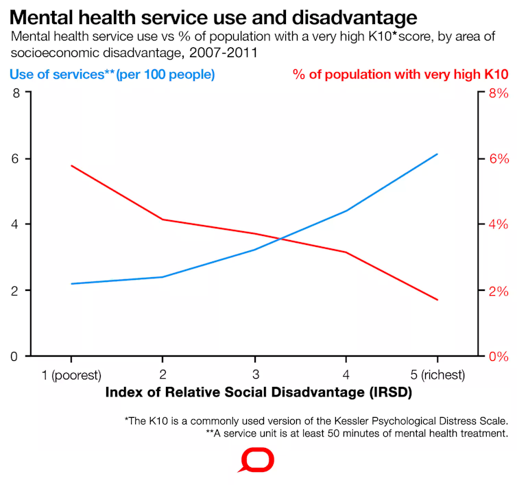 In our research, of adults who recorded “very high” levels of psychological distress on what’s called the Kessler Psychological Distress Scale, more than three times as many (30%) came from the most socioeconomically disadvantaged fifth of Australian areas than from the most affluent fifth (9%).