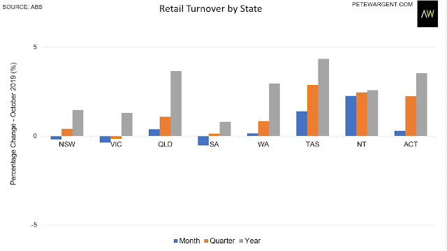 Retail turnover missed expectations of a 0.3 per cent increase in October, instead recording a decline (although the result rounded to 0.0 per cent, after an increase of just 0.2 per cent in September).
