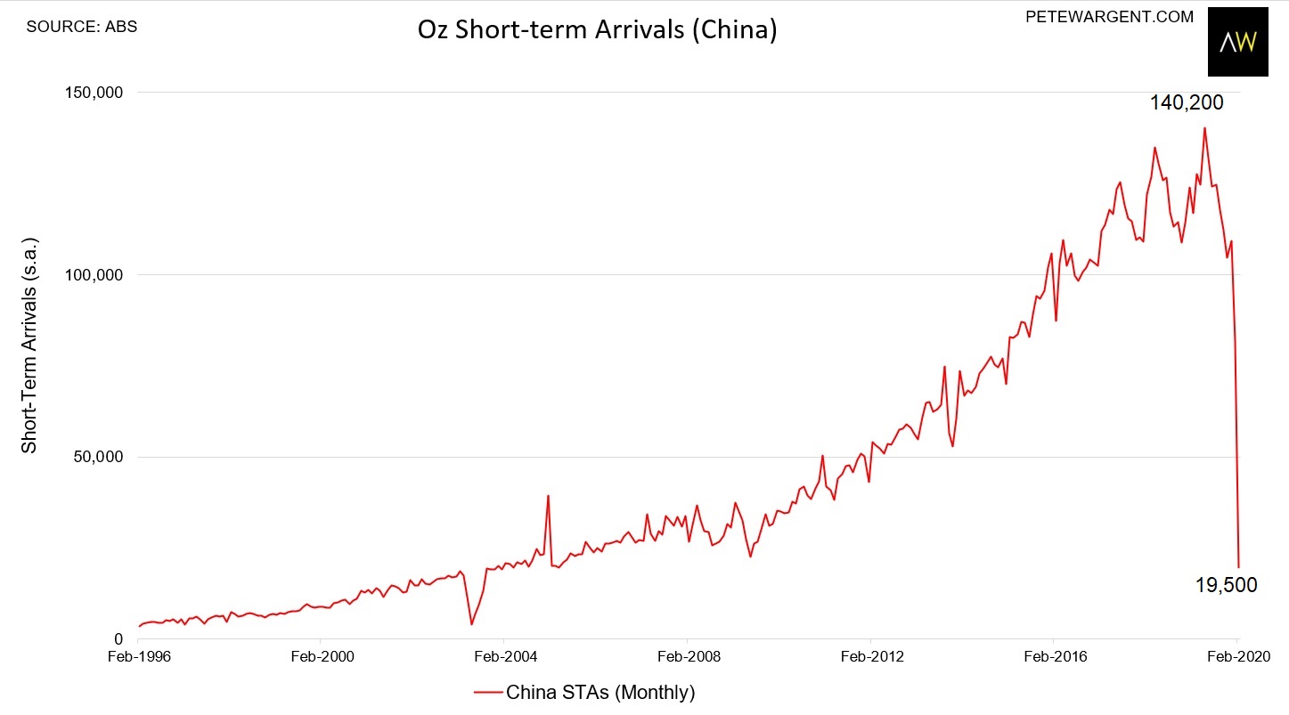 Chinese short-term arrivals into Australia fell to a seasonally adjusted total of just 19,500 in February, to be down by about 90 per cent.