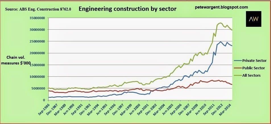 In chain volume measures terms the charts show that although activity remains at a highly elevated level, the peak of the mining construction boom appears to have been way back in the September 2012 quarter.