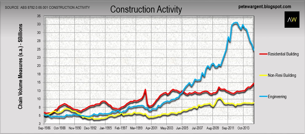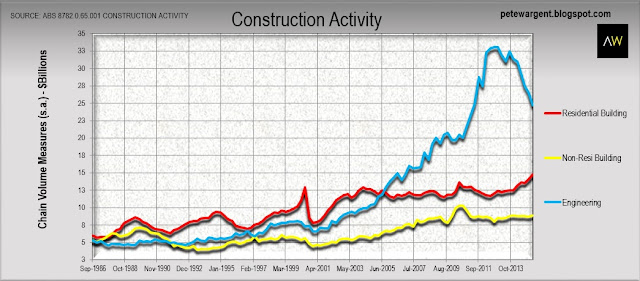 Piecing these figures together it's clear that residential construction alone will not fully compensate for the decline in mining capital expenditure, with total construction activity of $48.3 billion now declining back to the levels seen in Q4 2011.