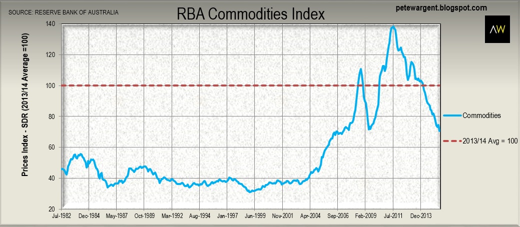 In Aussie dollar terms the decline has been a somewhat less dramatic 8.5 per cent year-on-year, but nevertheless Australia's terms of trade (TOT) remain well above their long run average (and TOT booms have historically tended to over-shoot on the downside too).