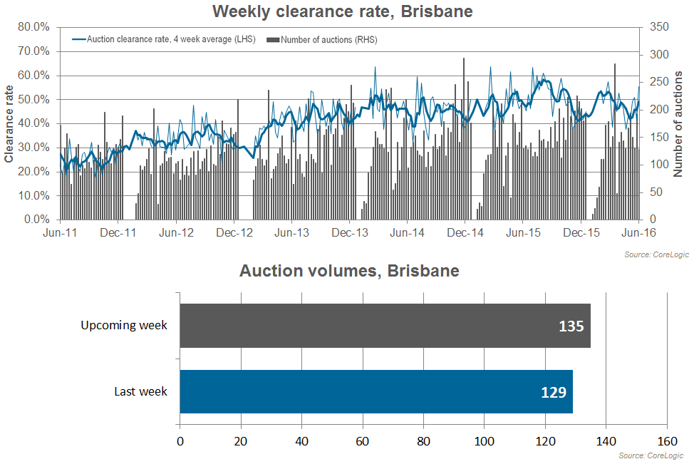 This week auction activity across Brisbane fell, from 192 auctions last week to 129 this week. Last week Brisbane’s clearance rate was 41.7 percent, however preliminary results show a weekly rise to 55.4 percent this week. One year ago, 130 Brisbane auctions were held with a clearance rate of 48.5 percent. Across the Gold Coast, the preliminary clearance rate this week is 35.3 percent, compared to 40.7 percent last week. There were 46 auctions held across the region, down from 84 last week.
