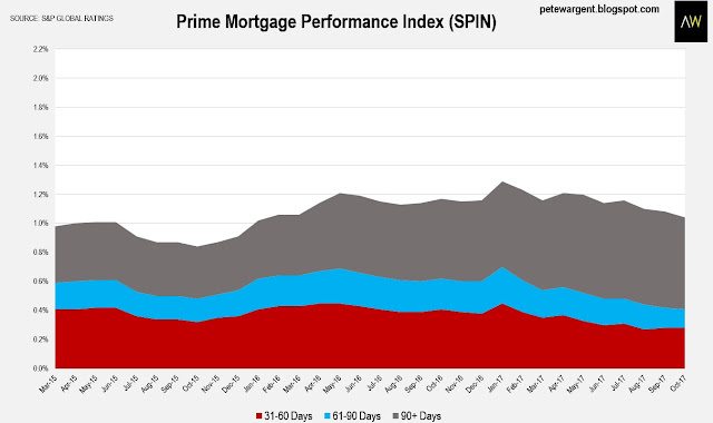 S&P Global Ratings has reported that Australia's prime SPIN 30+ day delinquencies declined a little further from 1.08 per cent to 1.04 per cent in October 2017.