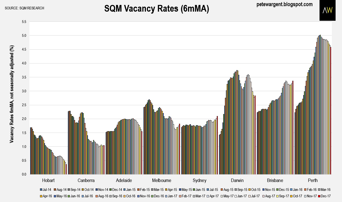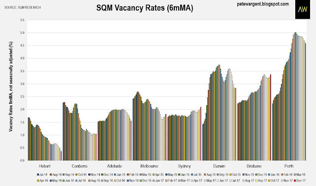 Perth and Darwin also seem to have turned a corner, with vacancy rates well down from a year earlier, while Melbourne's 2.1 per cent vacancy rate was also well down from 2.4 per cent in December 2016.