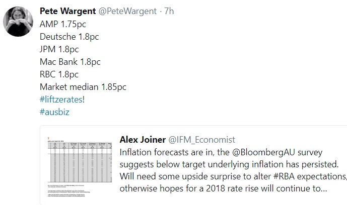 It showed a market median consensus for a quarterly result of +0.5 per cent, which would put annual underlying inflation at about the same level at +1.85 per cent.