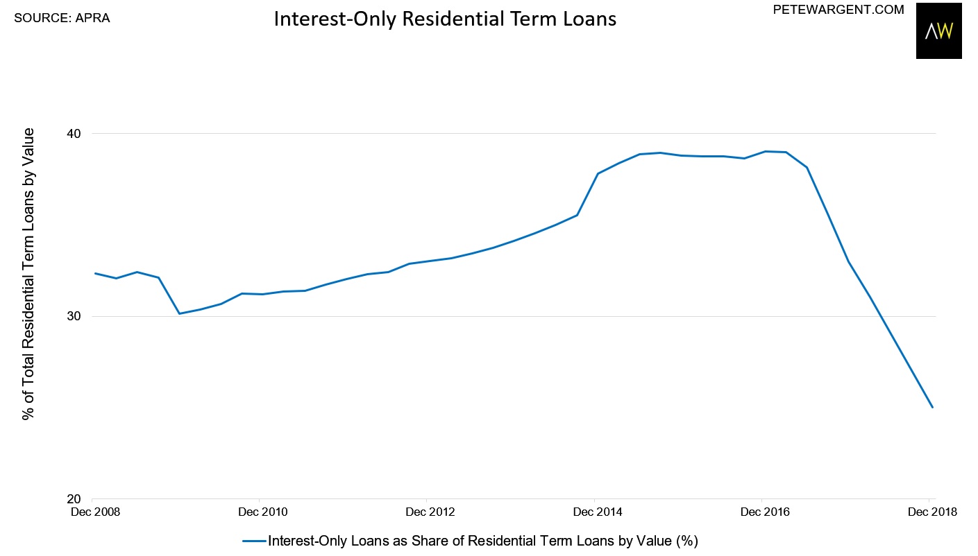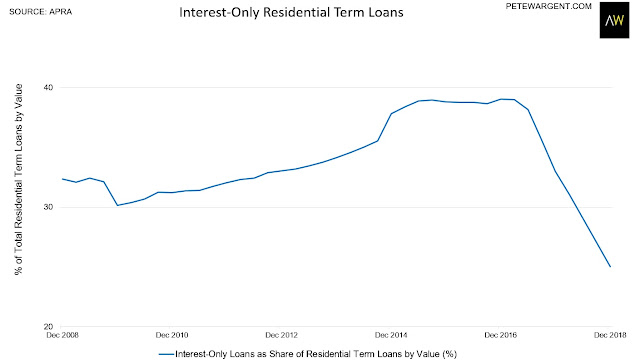 The stock of interest-only loans has been spectacularly reduced by regulatory tweaks and is also at the lowest share on record: probably down to about 21 per cent of residential loans by value by the end of this quarter, representing an epic decline from 39 per cent in early 2017.
