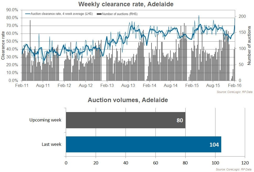 Adelaide’s preliminary clearance rate was 79.4 per cent this week, higher than last week at 61.1 per cent and also higher than one year ago (58.2 per cent). There were 104 Adelaide auctions this week, 97 last week and 94 held over the comparable week last year.