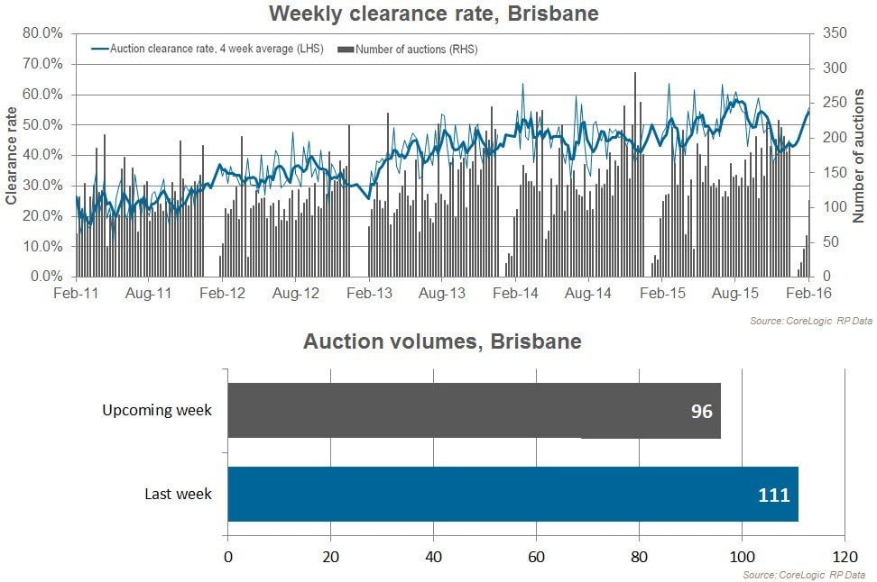 In Brisbane the preliminary clearance rate was 55.8 per cent this week across 77 auction results. There were 111 auctions held in Brisbane this week, compared to 60 last week, with a clearance rate of 52.7 per cent and 109 last year when 47.6 per cent of auctions were successful. Further south, across the Gold Coast there were 33 auctions reported this week with 13 sales.