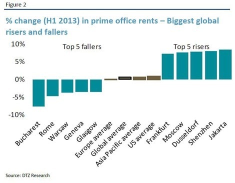 In its first ever global office review for the first half of 2013, DTZ Research showed "subdued rental growth globally" of less than 1% as the slowing Chinese economy, subpar US growth and persistent European economic difficulties continued to weigh heavily on corporate tenants around the world.