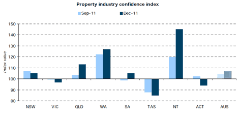 The Northern Territory registered the biggest jump in confidence over the last quarter of 2011 and has the highest rating on the confidence index, followed by Western Australian and Queensland, which both recorded strong gains.