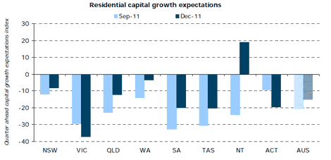 Survey respondents expect residential prices to fall further in the March quarter in all states and territories bar the Northern Territory, despite back-to-back November and December rate cuts and an increasing likelihood that the RBA will cut rates further in early 2012.