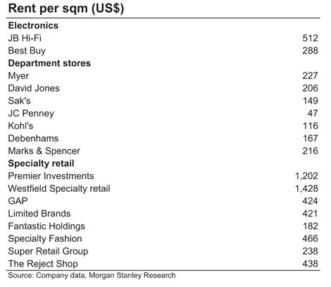 In the electronics category JB Hi-Fi pays US$512 per square compared, with US-based retailer Best Buy, which pays US$288 per square metres on average.