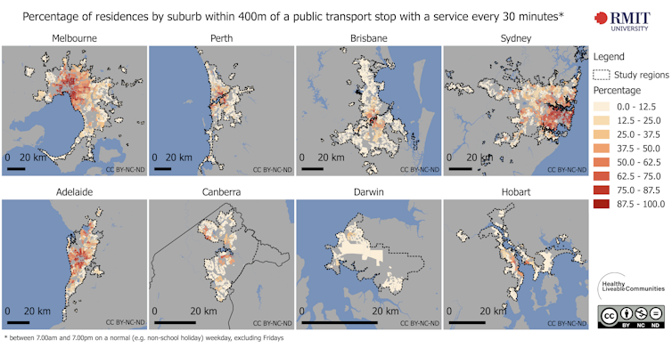 Residents of some cities face greater public transport access barriers than others. But these results show the majority of dwellings in the capital cities do not have access to nearby and frequent public transport services during weekday work hours.