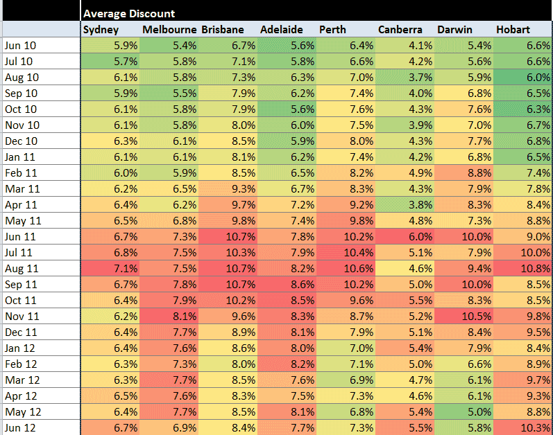 Adelaide vendors offered an average discount of 8.6% in September 2011, but in June 2012 that had fallen to 7.7%. However, the previous month the average discount required was 8.1% in Adelaide, not at its 2011 peak but still in the "red zone", according to APM.