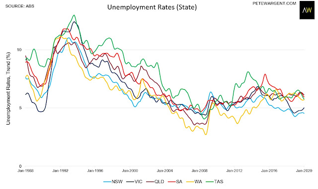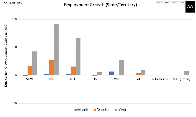 Employment growth remained solid in Victoria, to be up +91,000 over the year, with Queensland next up at +67,000, but New South Wales (+43,000) has clearly come off the boil, and there's all but nothing meaningful to speak of elsewhere.