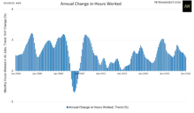 Finally, the trend result for monthly hours worked was just +1.3 per cent higher year-on-year, which is also a lacklustre read and well below the rate of employment growth.