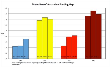 Australian banks’ funding gap is the money they need to raise from the expensive overseas inter-banking market. It’s expensive because global banks no longer trust each other, as no one knows the extent of bank exposure to high-risk securities.