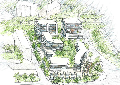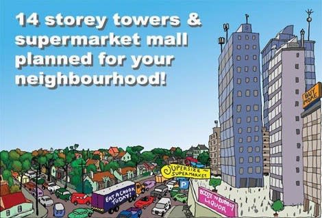 The initial plans for the Lewisham project raised the ire of the local community during the public consultation period because of its height, its density and the potential impact on local traffic, stemmed around nine buildings of up to 14 storeys. The campaigners at the Marrickville Greens produced an emotive artists' sketch (pictured above) which depicted the scheme when it was envisaged as 14 storeys and supermarket.