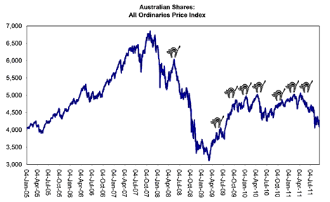 I heard the other day that the CIA has inducted exposure to Australian equities as an unofficial form of torture. Since January 2009 I have warned of the risk of painful "dead-cat-bounces" in the share market (see, for example, here). In May 2010, I argued here that there was every chance the 2007-08 crash would resemble its 1987 predecessor, and be followed by a protracted period of poor and volatile returns: