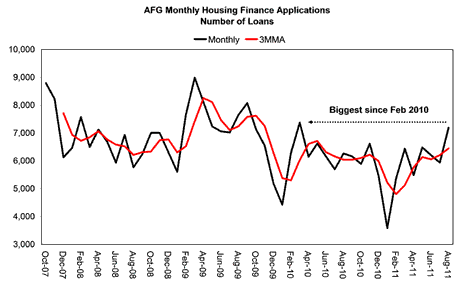 The first chart below shows the monthly number of AFG housing finance applications, which in August hit its highest level in 19 months. (AFG is